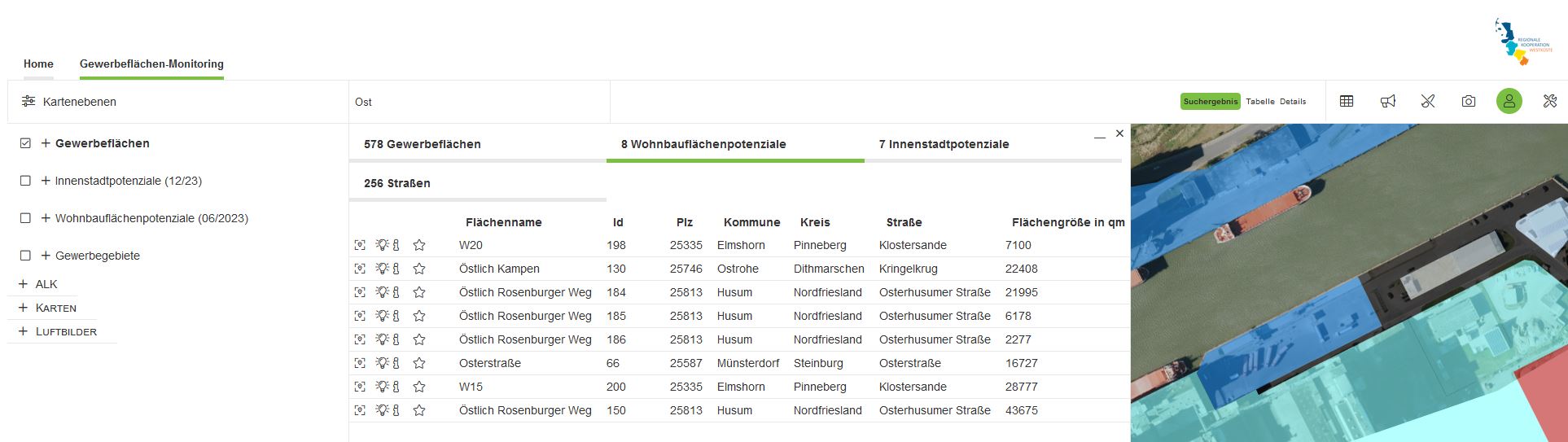Die Abbildung zeigt einen Ausschnitt der Fachanwendung Gewerbeflächenmonitoring Westküste.