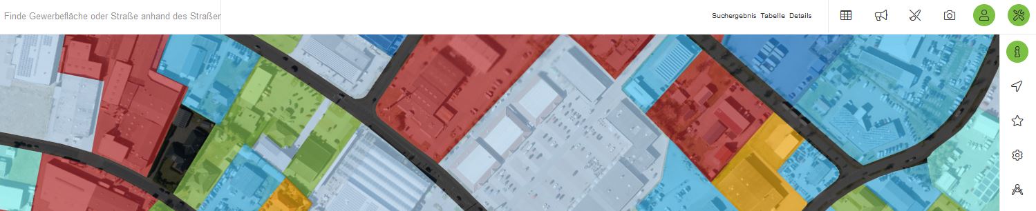 Die Abbildung zeigt ein Beispiel aus der Fachanwendung Gewerbeflächenmonitoring Westküste mit geöffneter Anzeige der Werkzeuge (rechts)
