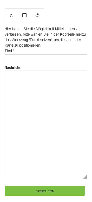 Ein Klick auf das Kommunikationswerkzeug 'Mitteilungen', öffnet einen Dialog um in den angebotenen Textfeldern 'Titel' und 'Nachricht' eine neue Notiz zu schreiben und zusätzlich eine Markierung in der Karte zu verorten, die mit dieser Notiz verbunden ist.