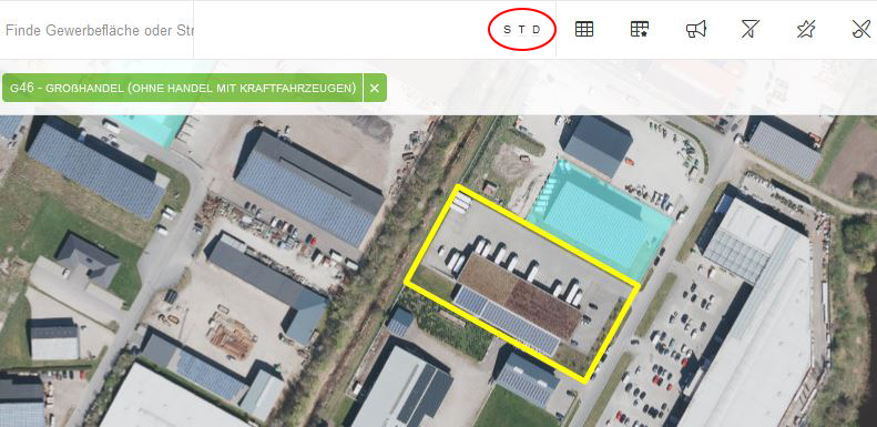 Die oben gezeigte Abbildung zeigt ein Beispiel aus der Fachanwendung Gewerbeflächenmonitoring Westküste. Es wurde in den Karteneben die Legende für den Wirtschaftszweig Verkehr und Lagerei (blaue Flächen) zugewiesen und der Kartenfilter gesetzt, sodass nur diese Flächen in der Karte angezeigt werden. Eine Geometrie wurde selektiert und wird in der Karte mit gelber Umrandung dargestellt. Durch diese Bearbeitung erscheinen im Kopfbereich die zusätzlichen Schaltflächen Selektionstabelle, Kartenfilter, Selektion und Legende zurücksetzen.